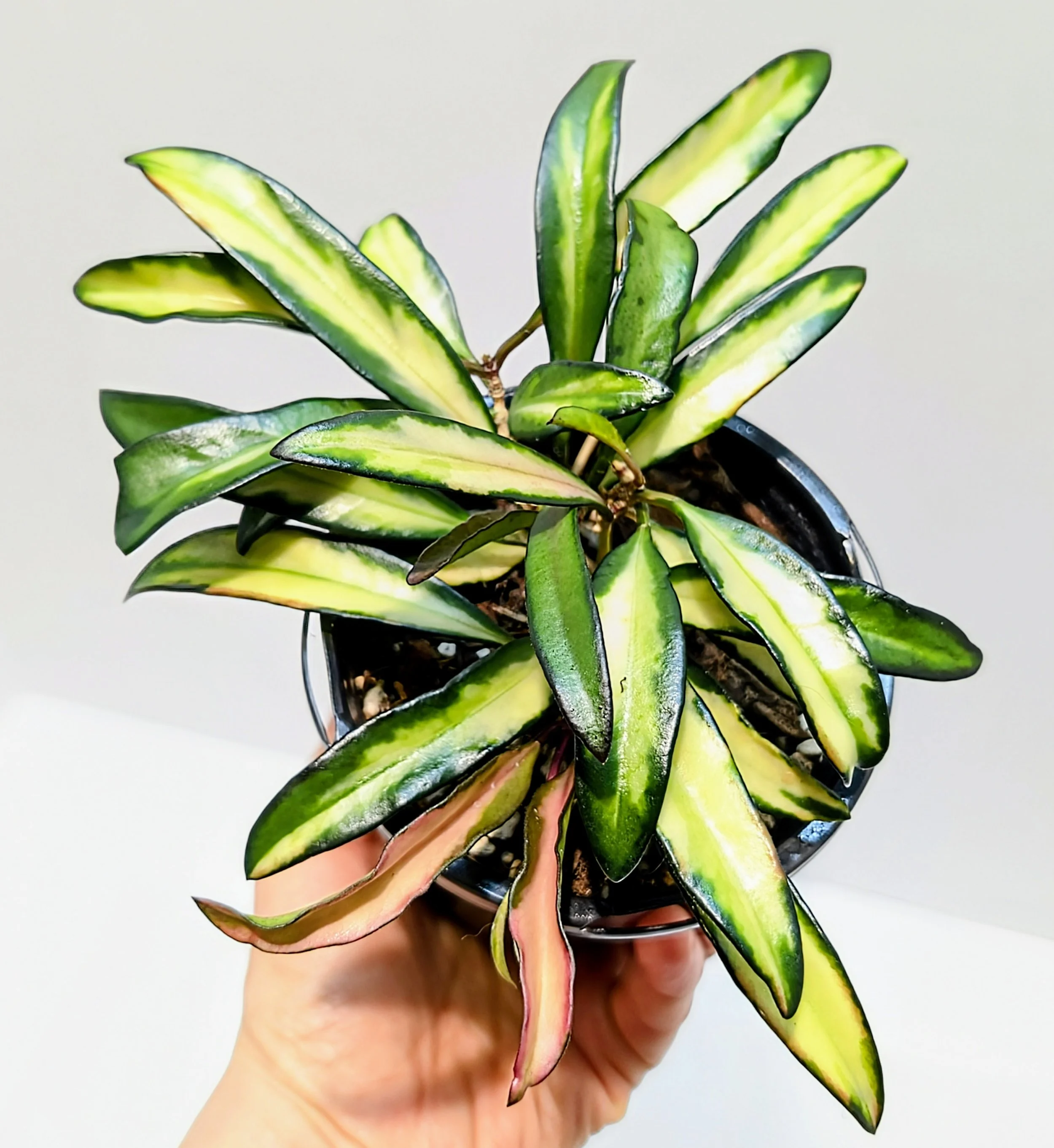 You will receive the plant in the photos / video. Wonderful variegation is this Hoya's claim to fame! Grabs attention in a hanging basket or in a pot, the colors are so bright and ever-changing as the leaf matures. A slow grower but will reward your patience with small clusters of mauve flowers. Truly a fantastic sight against the foliage. A must-have for every Hoya collection.